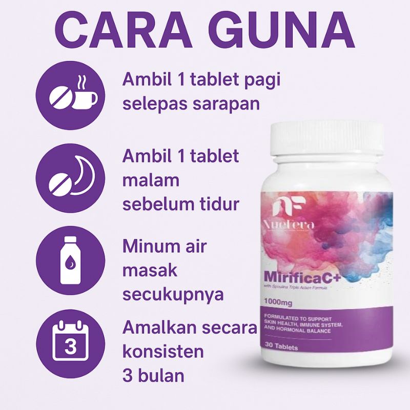 Mirifica C+ diformulasi dalam bentuk tablet mudah makan. Hanya ambil 2 biji sehari selepas makan, pagi dan malam. Digalakkan minum air secukupnya untuk penyerapan optimum dalam tubuh.