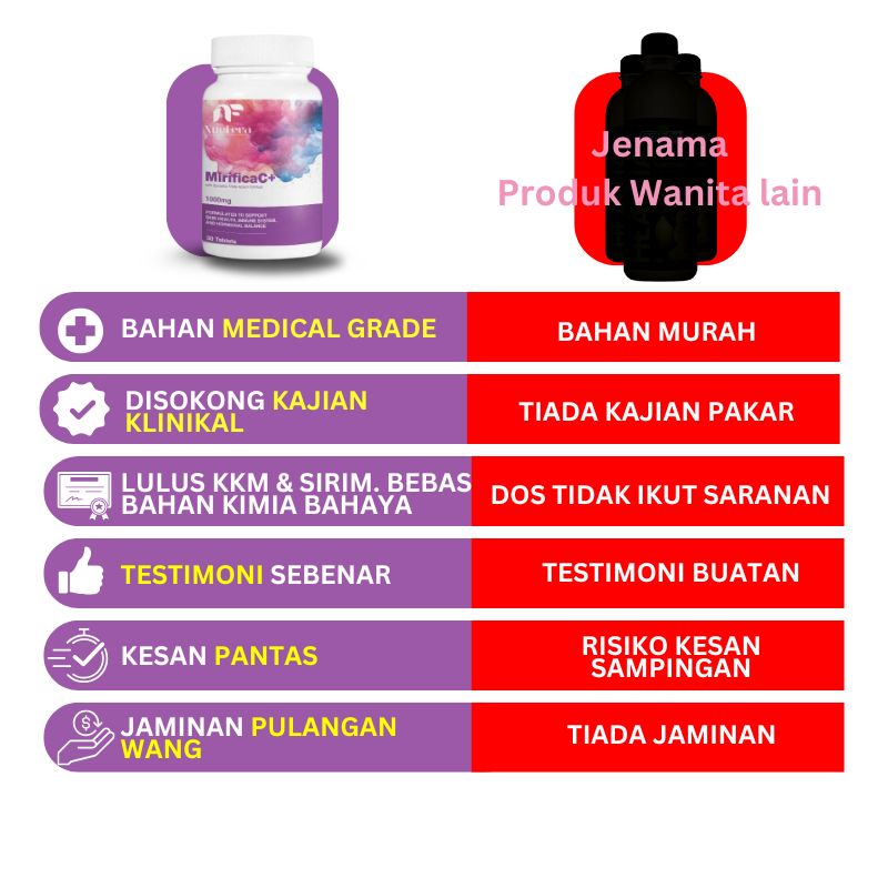* Mirifica C+ tidak mengandungi sebarang bahan terlarang atau dadah yang dikawal oleh KKM.